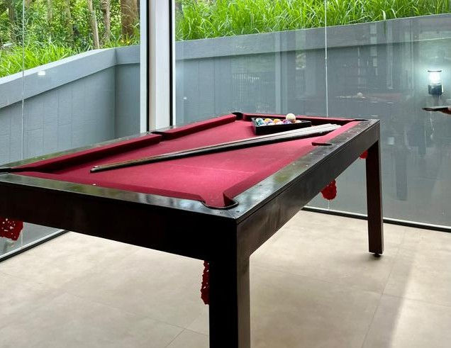 Sala de estar con sofá cama, smart TV, equipo de karaoke y mesa de billar.