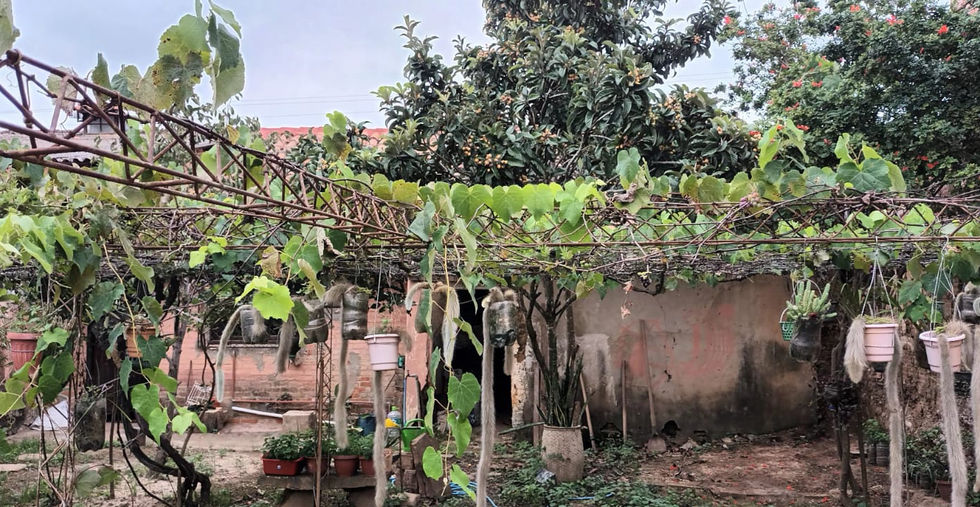 🌿 Patio interno con parras de uva, vegetación establecida y suelo fértil.